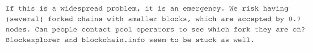 2013 年 3 月,由于比特币分叉,比特币价格暴跌 23% 。升级错误导致产生了两条链,它们在 6 小时内同时记录了不同版本的交易历史。社区马上注意到了这一点,并将所有版本都降级到 0.7 版之后,问题才能得到解决。在这几个小时内,Mt. Gox 停止了存款功能,导致比特币崩盘。
