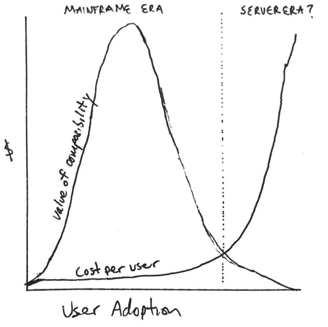这就是区块链的大型机时代。尽管可组合性确实带来了早期的网络效应——集中安全性、用户群、数据和代码,但是由于大型机的吞吐量限制,采用量的增加会造成边际收益递减。这反过来会驱高每一位新增用户和开发者的成本。绘制成图表则如下所示: