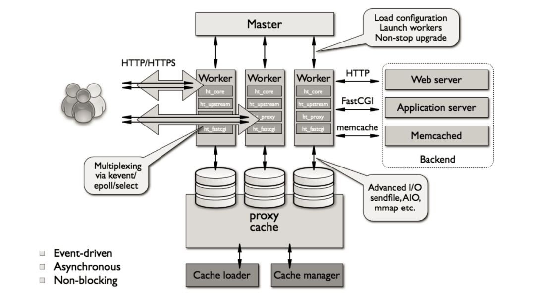 Master/Worker 结构:一个 Master 进程,生成一个或多个 Worker 进程。