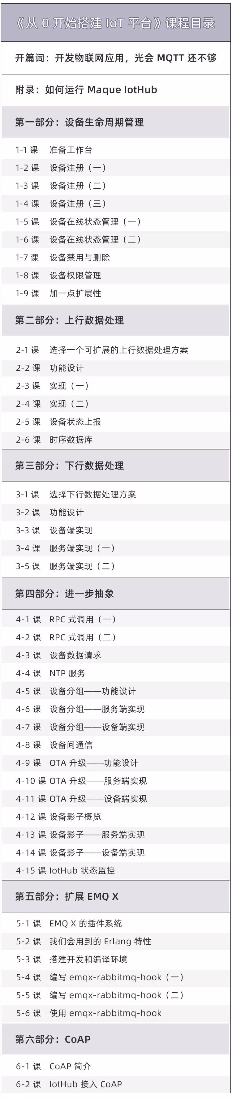因此,我希望为大家制作一门《从 0 开始搭建 IoT 平台》的课程,把我积累的一些物联网平台在架构和设计模式等方面的经验分享给大家,学完之后,应该可以覆盖大家在物联网开发中 80% 的场景和可能遇到的设计和架构问题。