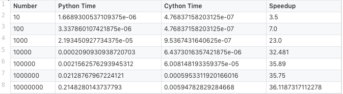 看看下表,其中显示了Cython为不同的阶乘值提供了多少速度。我们使用Cython获得了超过36倍的加速!