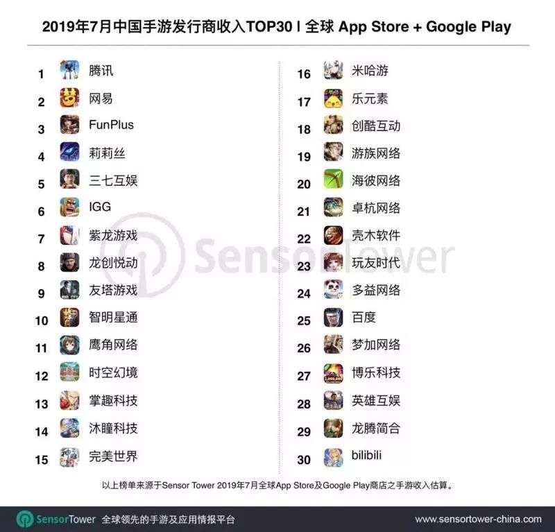 - Sensor Tower 7月中国手游发行商海外收入排名:腾讯、网易前二