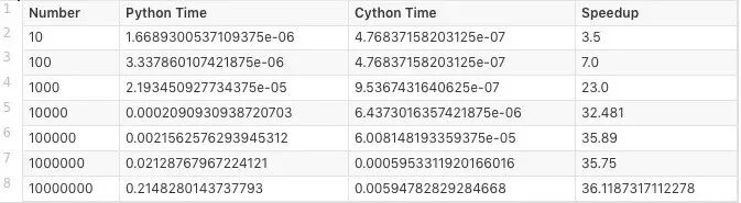 看看下表,其中显示了Cython为不同的阶乘值提供了多少速度。我们使用Cython获得了超过36倍的加速!