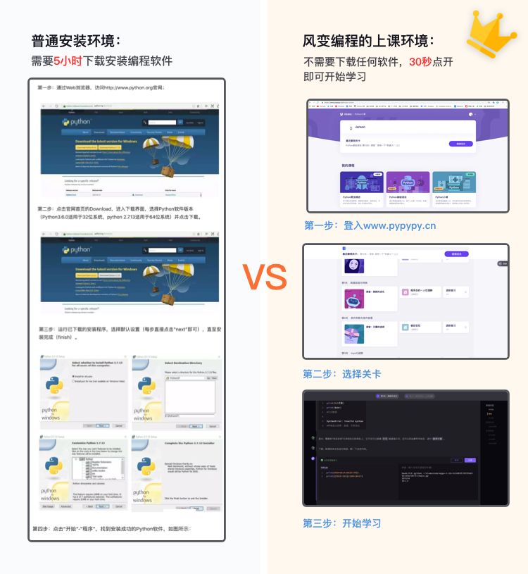 传统编程学习对于一个新手来说平均需要花5个小时安装一大堆软件和程序,花费时间还占用电脑空间。Python小课只需要用浏览器打开,不用安装任何程序。