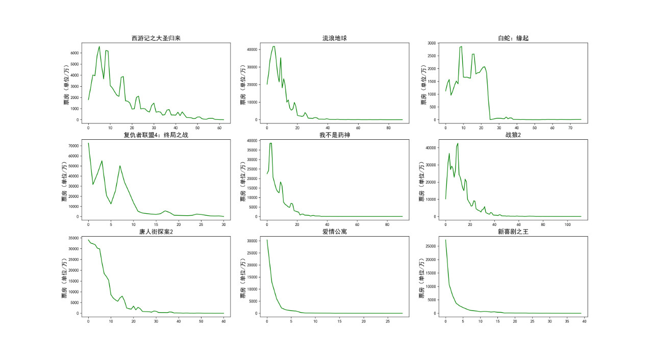 但这里有个问题,不同电影的票房走势是不一样的。以下是我们从猫眼票房上随手找的几部大片或类似电影,他们的票房走势: