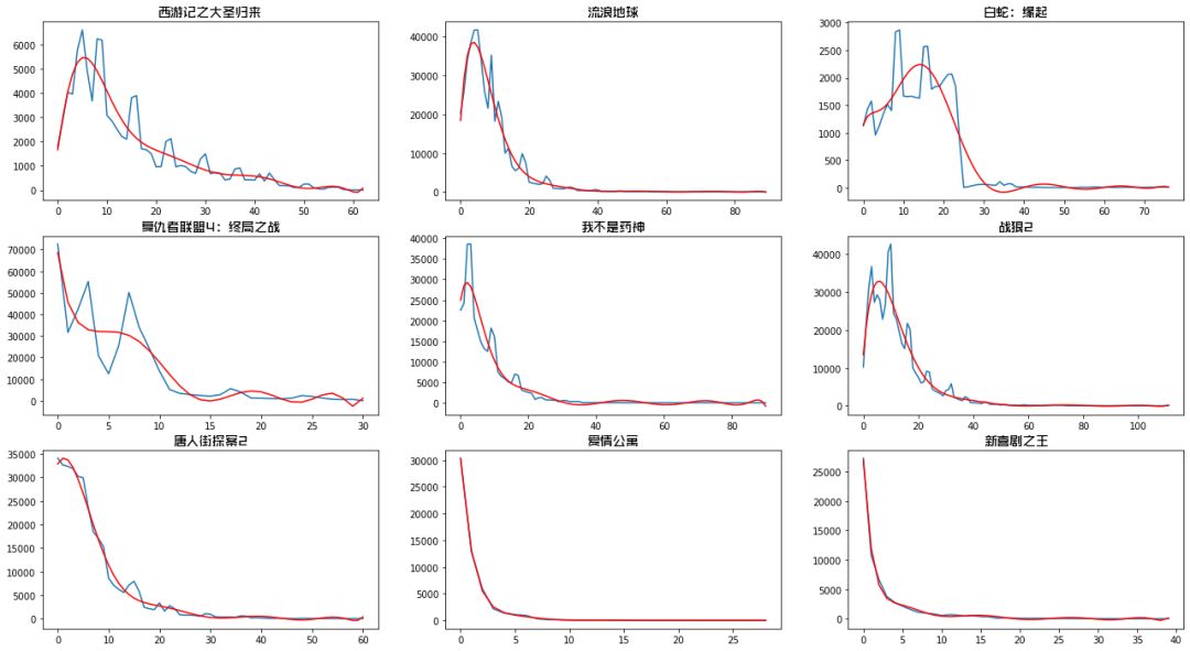 对于上述9部电影的拟合效果(红线为拟合结果):