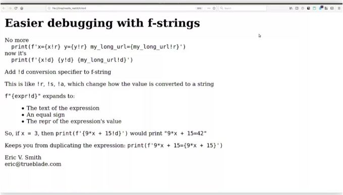 在python3.8中已经实现上述功能,不过不再使用!d了改为了f"{a=}"的形式,看过这个视频的发现没有!d应该很懵逼.
