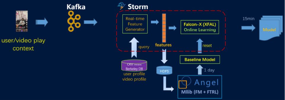 上图所示是腾讯短视频部门的一个使用案例。用户的视频播放日志和上下文信息被实时转发给Kafka,流数据引擎Storm订阅Kafka的数据。Storm是一个实时的特征生成器,它从一个离线的key-value存储中获得用户画像和视频信息,将两者拼接起来生成特征。生成的特征被传输到在线训练系统中来更新在线模型;同时,这些特征也被转存到HDFS作为离线训练的输入。离线模型通常用来初始化在线训练系统,当出现异常时,离线模型还可以用来重置在线系统。本案例用到的推荐算法是FM,训练样本24亿条,特征维度为63611,在Spark上训练耗时10多个小时,应用Angel后减少至1小时。案例二:金融反欺诈