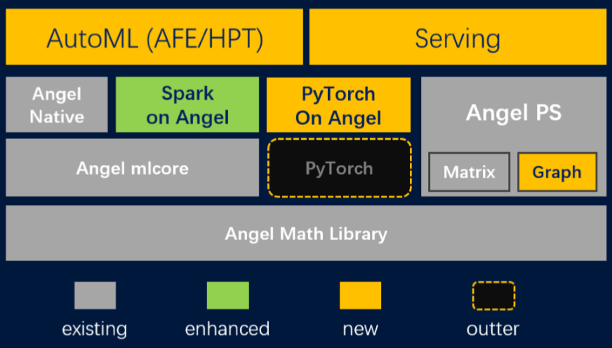 MLcore是Angel自研的一套算法内核,它支持自动求导,可以使用JSON配置文件定义和运行算法。除此之外,在3.0版本中,Angel还集成了PyTorch作为计算引擎。在计算引擎层之上是计算框架,它们可以看作计算引擎的容器,目前支持3种计算框架:原生的Angel,Spark On Angel(SONA)和PyTorch On Angel(PyTONA),这些计算框架可以使得Spark和PyTorch用户可以无缝切换到Angel平台。最上层是两个公共组件:AutoML和模型服务。