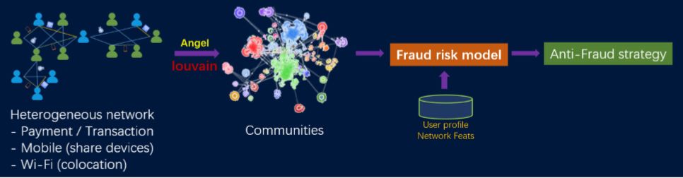 金融欺诈检测是大规模图学习的常见案例,其网络数据是异构的,包含几种不同类型的边:· 交易关系:用户A和用户B之间如存在交易关系表明他们之间曾出现过交易行为· 设备关系:用户A和用户B之间如存在设备关系表明他们曾共享过同一个设备· Wi-Fi关系:用户A和用户B之间如存在Wi-Fi关系表明他们曾通过一个Wi-Fi连接到互联网金融诈骗者通常共享设备和Wi-Fi,通过扩展边缘关系生成社区。Angel上的fast unfolding算法可以有效地发现这些社区。下游的欺诈风险模型可以将这些社区的用户画像和网络特征作为输入来学习和推到反欺诈策略。该图数据包含15亿个节点和200亿条边,基于Spark GraphX的实现耗时20小时,而Angel仅需5小时。