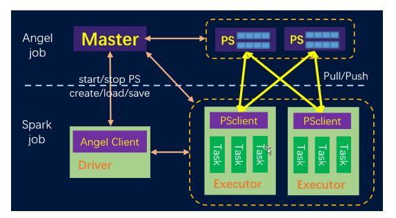 · Spark Driver:中央控制节点,负责计算任务的调度和一些全局的控制功能,例如发起创建矩阵,初始化模型,保存模型,写checkpoint以及恢复模型命令