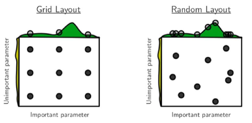 · 随机搜索:随机采样超参数组合,并评估抽样组合。虽然这种方法有可能关注更重要的超参数,但是仍无法保证找到最佳组合