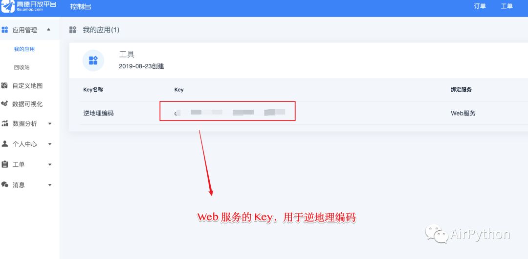 然后,进入高德开放平台,申请一个 Web 服务的应用,获取到一个 「Key」用于逆地理编码 API。