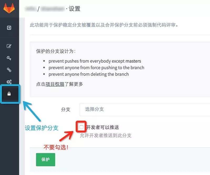 (2) GitLab 在创建项目仓库后一定要把主要分支,也就是 master 和 develop 给保护起来。为它们设置权限,只有项目负责人可以进行推送和删除等操作。