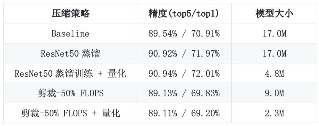 我们以MobileNetV1模型为Baseline,在ImageNet 1000类分类任务上对PaddleSlim的压缩效果进行了实测:
