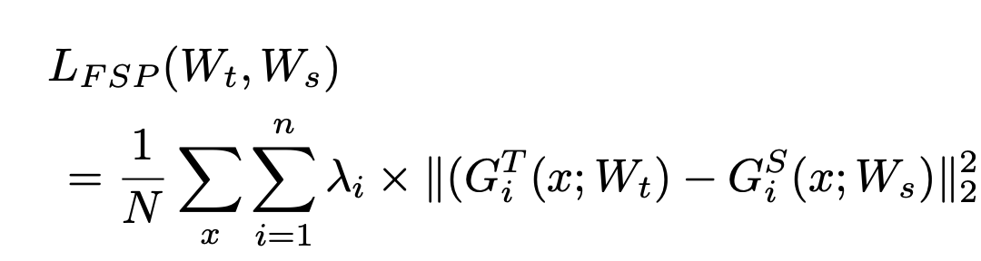 大模型和小模型不同层之间分别获得多个 FSP 矩阵,对于 Resnet 网络结构,每个 stage 可产生一个 FSP 矩阵,然后使用 L2 loss 让小模型的对应层 FSP 矩阵和大模型对应层的 FSP 矩阵尽量一致,具体公式如下: