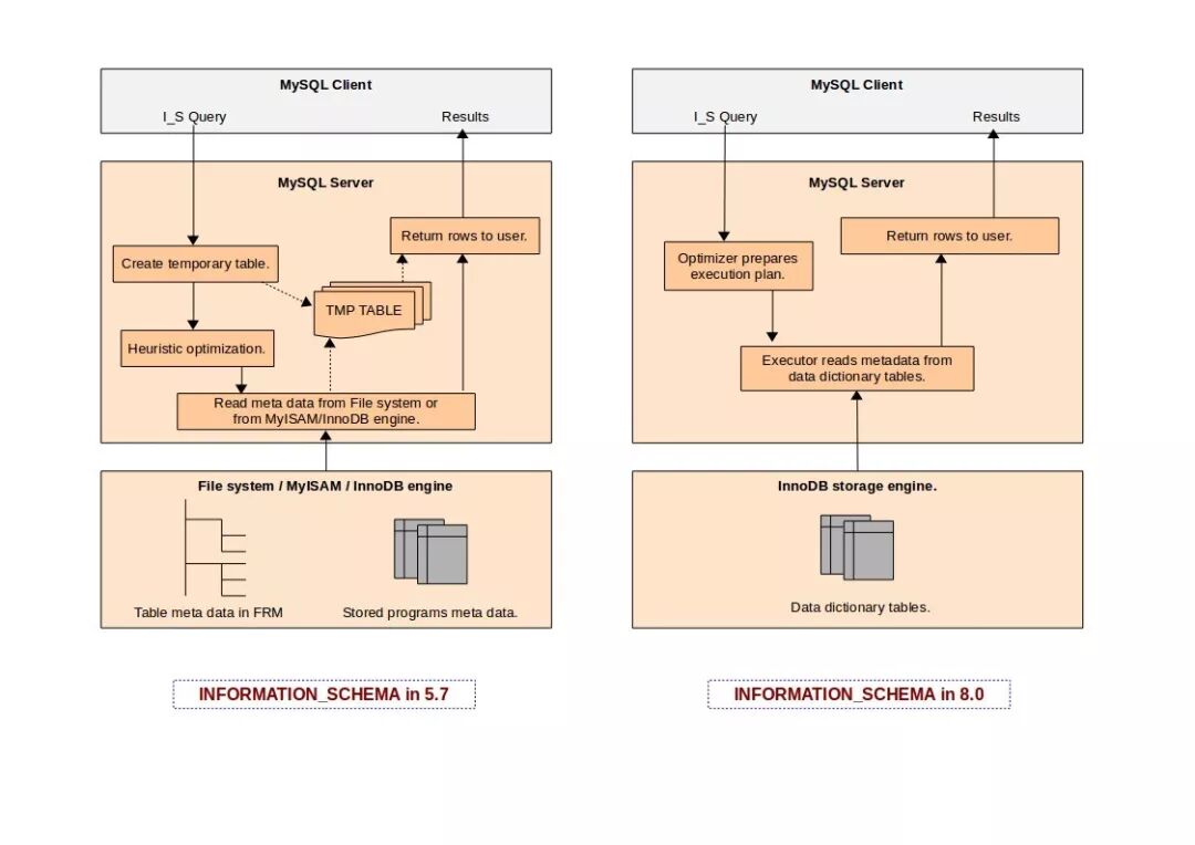 As we can see from the EXPLAIN output, we see that the former query would use the values provided in WHERE clause for the TABLE_SCHEMA and TABLE_NAME field as a key to read the desired FRM files from the file system. However, the latter query would end up reading all the FRM in the entire data directory, which is very costly and does not scale.从EXPLAIN的输出可以看到。我们看到前一个查询将使用WHERE子句中为TABLE_SCHEMA和TABLE_NAME字段提供的值作为键,从文件系统读取所需FRM文件。但是,后一个查询最终将读取整个数据目录中的所有FRM,这非常昂贵且无法扩展。One of the major changes in 8.0 is the introduction of a native data dictionary based on InnoDB. This change has enabled us to get rid of file-based metadata store (FRM files) and also help MySQL to move towards supporting transactional DDL. For more details on introduction of data dictionary feature in 8.0 and its benefits, please look at Staale’s post here.8.0中的一个主要变化是引入了基于InnoDB的数据字典。这一变化使我们能够摆脱基于文件的元数据存储(FRM文件),并帮助MySQL转向支持事务DDL。有关在8.0中引入数据字典功能及其优点的更多详细信息,请在此处查看Staale的文章。Now that the metadata of all database tables is stored in transactional data dictionary tables, it enables us to design an INFORMATION_SCHEMA table as a database VIEW over the data dictionary tables. This eliminates costs such as the creation of temporary tables for each INFORMATION_SCHEMA query during execution on-the-fly, and also scanning file-system directories to find FRM files. It is also now possible to utilize the full power of the MySQL optimizer to prepare better query execution plans using indexes on data dictionary tables.既然所有数据库表的元数据都存储在事务数据字典表中,它使我们能够将INFORMATION_SCHEMA表设计为数据字典表上的数据库视图。这消除了成本,例如在执行期间为每个INFORMATION_SCHEMA查询创建临时表,以及扫描文件系统目录以查找FRM文件。现在还可以利用MySQL优化器的全部功能,使用数据字典表上的索引来获得更好的执行计划。The following diagram explains the difference in design in MySQL 5.7 and 8.0.下面的图解释了MySQL 5.7和8.0设计上的区别