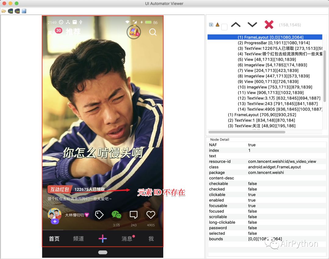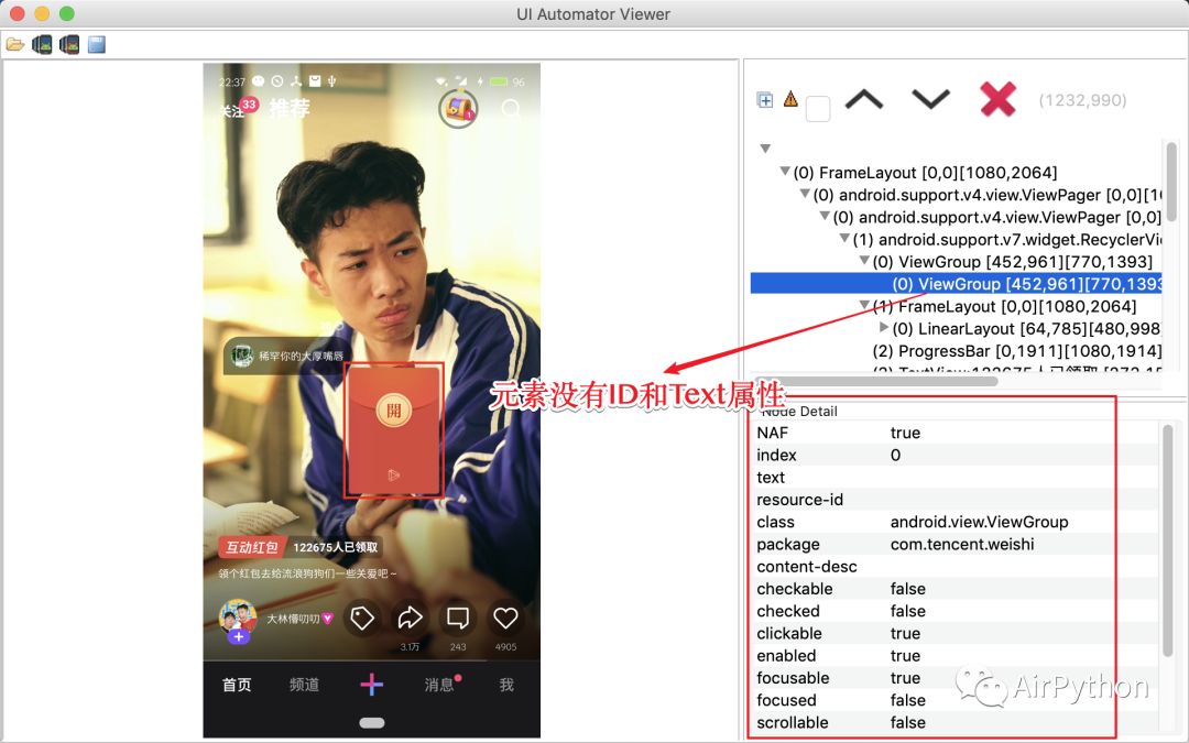 第三步,如果判断当前视频内包含互动红包元素,就可以执行「抢红包」的操作了。首先,利用 Monitor 截取红包出现那一刻的界面元素树,依然可以看到红包图片元素不存在 ID 和 Text 属性。