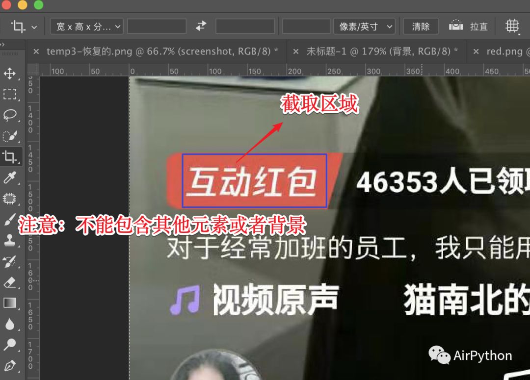 利用「PS」把互动红包元素图片从屏幕截图中裁剪出来。需要注意的是,由于这个元素形状不规则,这里只能裁剪一个规则的矩形区域,不能截取其他多余的区域,否则会导致图片比对会失败。接着利用 adb 命令截取手机屏幕的图片,然后保存到本地。
