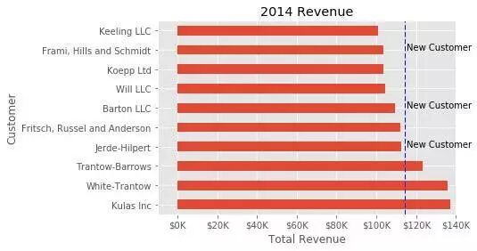 fig, ax = plt.subplots() top_10.plot(kind= barh , y="Sales" , x="Name" , ax=ax)avg = top_10[ Sales ].mean() ax.set_xlim([-10000, 140000]) ax.set(title= 2014 Revenue , xlabel= Total Revenue , ylabel= Customer ) ax.axvline(x=avg, color= b , label= Average , linestyle= -- , linewidth=1) ax.text(115000, cust, "New Customer" ) formatter = FuncFormatter(currency) ax.xaxis.set_major_formatter(formatter) ax.legend().set_visible(False)