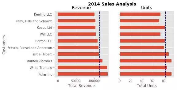 fig, (ax0, ax1) = plt.subplots(nrows=1 ,ncols=2 , sharey=True , figsize=(7 , 4 )) top_10.plot(kind= barh , y="Sales" , x="Name" , ax=ax0)ax0.set_xlim([-10000 , 140000 ]) ax0.set(title= Revenue , xlabel= Total Revenue , ylabel= Customers ) avg = top_10[ Sales ].mean()ax0.axvline(x=avg, color= b , label= Average , linestyle= -- , linewidth=1 ) top_10.plot(kind= barh , y="Purchases" , x="Name" , ax=ax1)avg = top_10[ Purchases ].mean() ax1.set(title= Units , xlabel= Total Units , ylabel= ) ax1.axvline(x=avg, color= b , label= Average , linestyle= -- , linewidth=1 ) fig.suptitle( 2014 Sales Analysis , fontsize=14 , fontweight= bold ); ax1.legend().set_visible(False ) ax0.legend().set_visible(False )