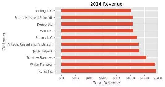 这是2014年的销售交易数据。为了使这些数据简短一些,我将对数据进行聚合,以便我们可以看到前十名客户的总购买量和总销售额。为了清楚我还会在绘图中重新命名列。