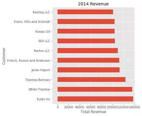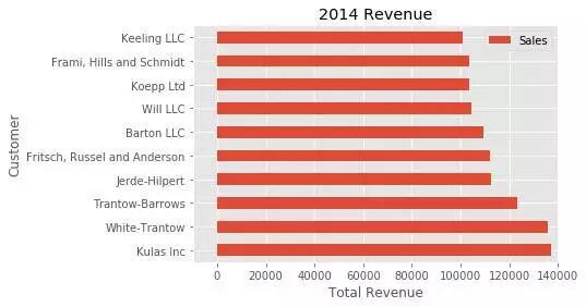fig, ax = plt.subplots() top_10.plot(kind= barh , y="Sales" , x="Name" , ax=ax)ax.set_xlim([-10000 , 140000 ]) ax.set (title= 2014 Revenue , xlabel= Total Revenue , ylabel= Customer )