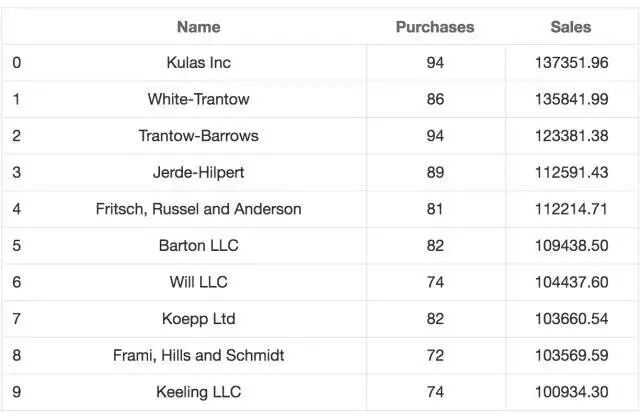 top_10 = (df.groupby( name )[ ext price , quantity ].agg({ ext price : sum , quantity : count }).sort_values(by= ext price , ascending=False ))[:10 ].reset_index()top_10.rename(columns={ name : Name , ext price : Sales , quantity : Purchases }, inplace=True)