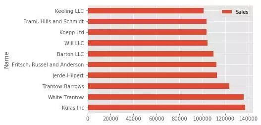 top_10.plot(kind= barh , y="Sales" , x="Name" , ax=ax)ax.set_xlim([-10000 , 140000 ]) ax.set_xlabel( Total Revenue ) ax.set_ylabel( Customer )