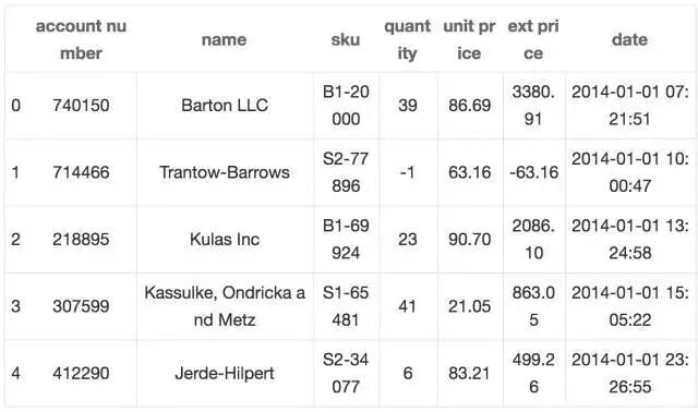 import pandas as pdimport matplotlib.pyplot as pltfrom matplotlib.ticker import FuncFormatterdf = pd.read_excel("https://github.com/chris1610/pbpython/blob/master/data/sample-salesv3.xlsx?raw=true" ) df.head()