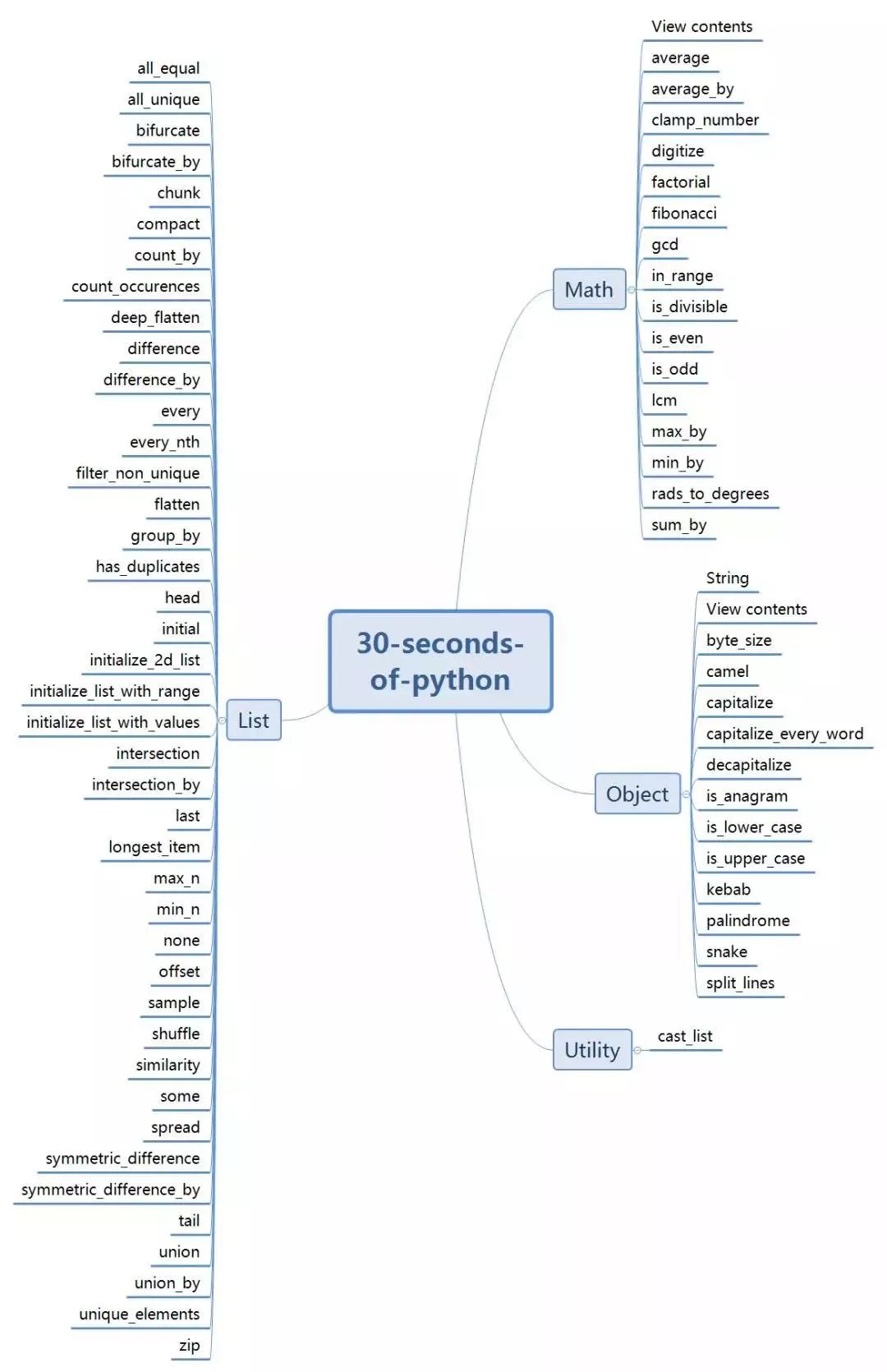 下面是30秒学Python的整个目录,分为几大板块:List、Math、Object、String、Utility,以下是整理的思维脑图。我挑选了10个实用并很有意思的方法分享给大家,其余的感兴趣可以自行学习。
