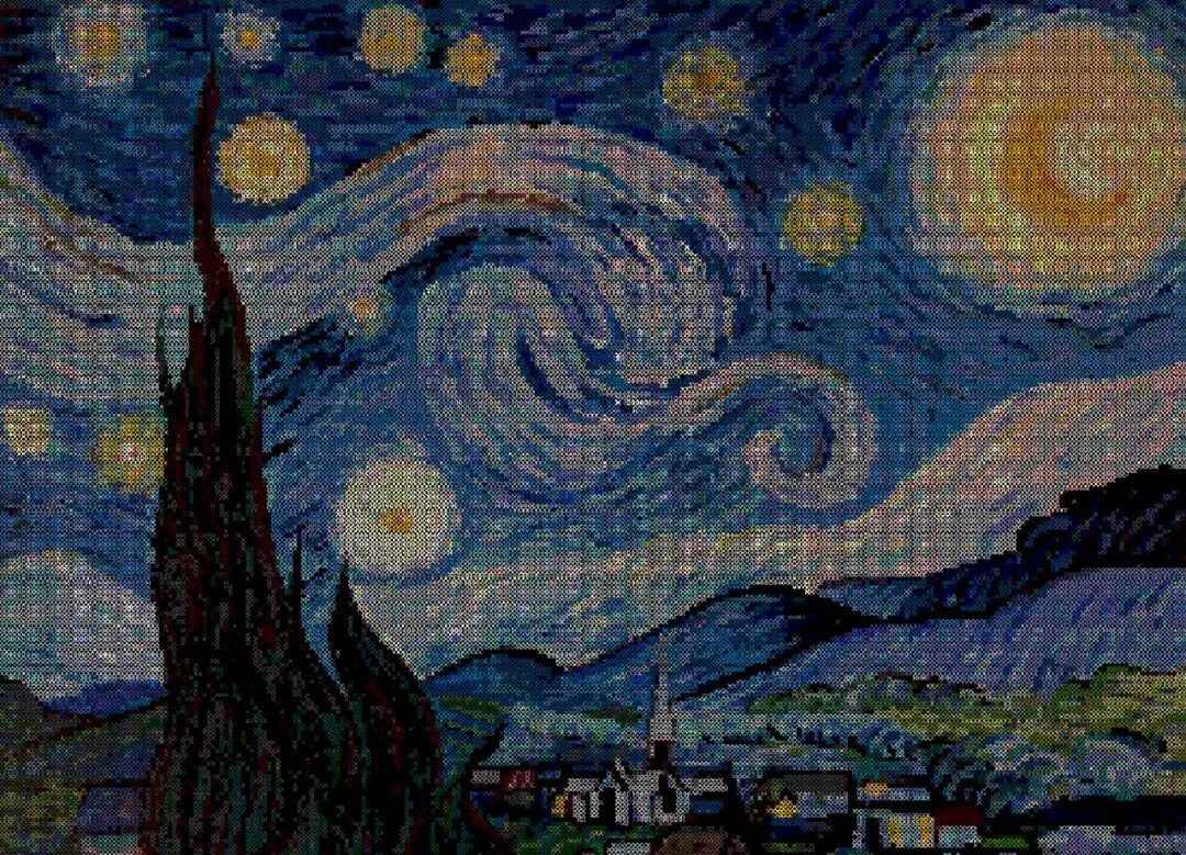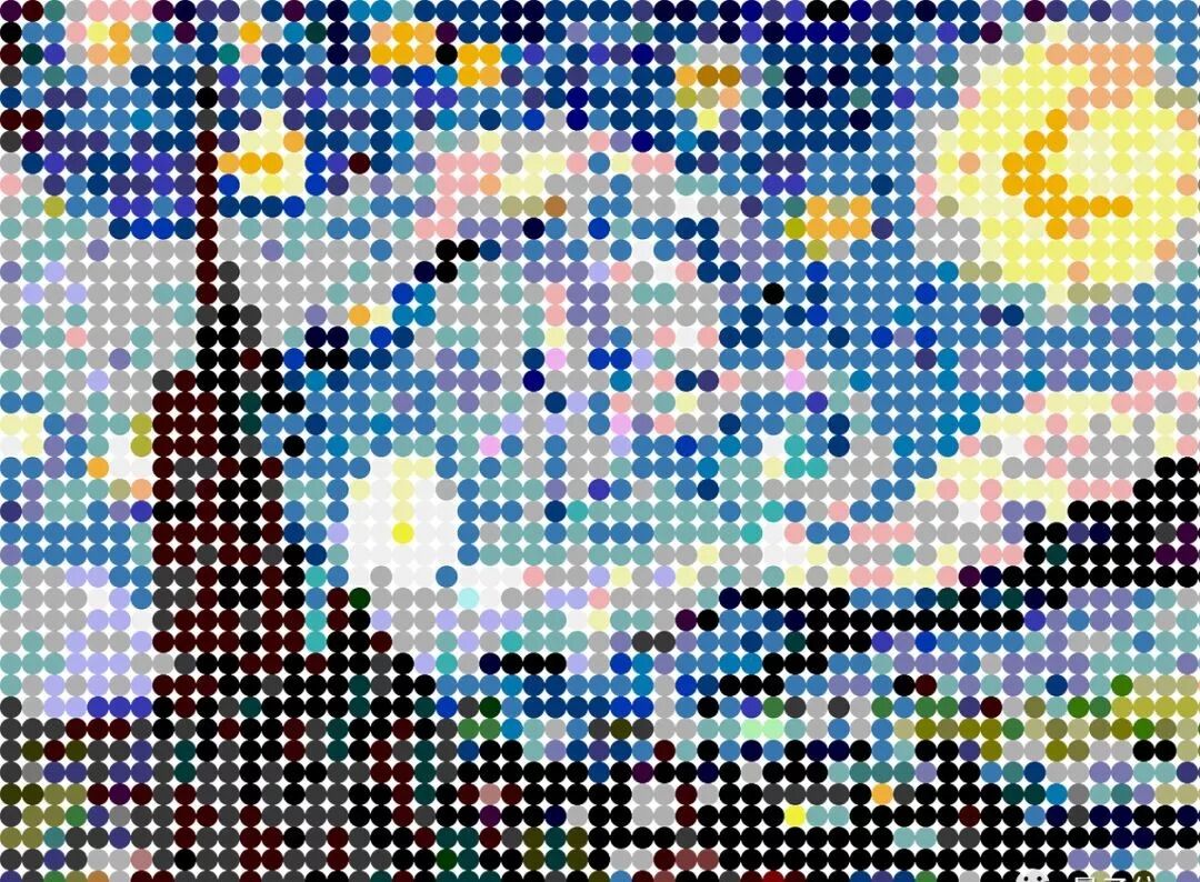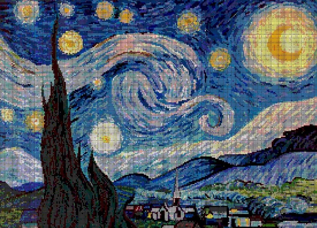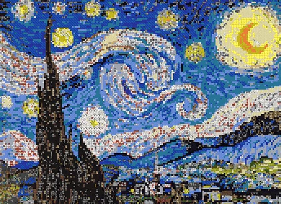 你可以用不同材质的 “瓦片”,拼接出各种图案。比如梵高的《星空》,项目中展示了 10×10、25×25、50×50 三种圆形拼成的规格: