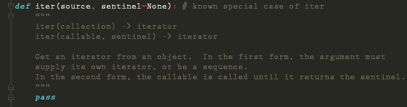 是不是懵逼了。iter 还有这种用法?这为啥是个死循环?这真的是个冷知识,关于这个知识点,你如果看中文网站,可能找不到相关资料。还好你可以通过 IDE 看py源码里的注释内容,介绍了很详细的使用方法。原来iter有两种使用方法,通常我们的认知是第一种,将一个列表转化为一个迭代器。而第二种方法,他接收一个 callable对象,和一个sentinel 参数。第一个对象会一直运行,直到它返回 sentinel 值才结束。
