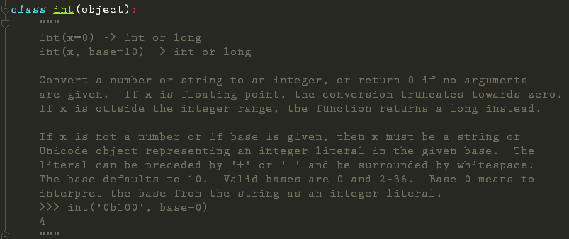 那int呢,这又是一个知识点,int 是一个内建方法。通过看注释,可以看出它是有默认值0的。你可以在终端上输入 int() 看看是不是返回0。