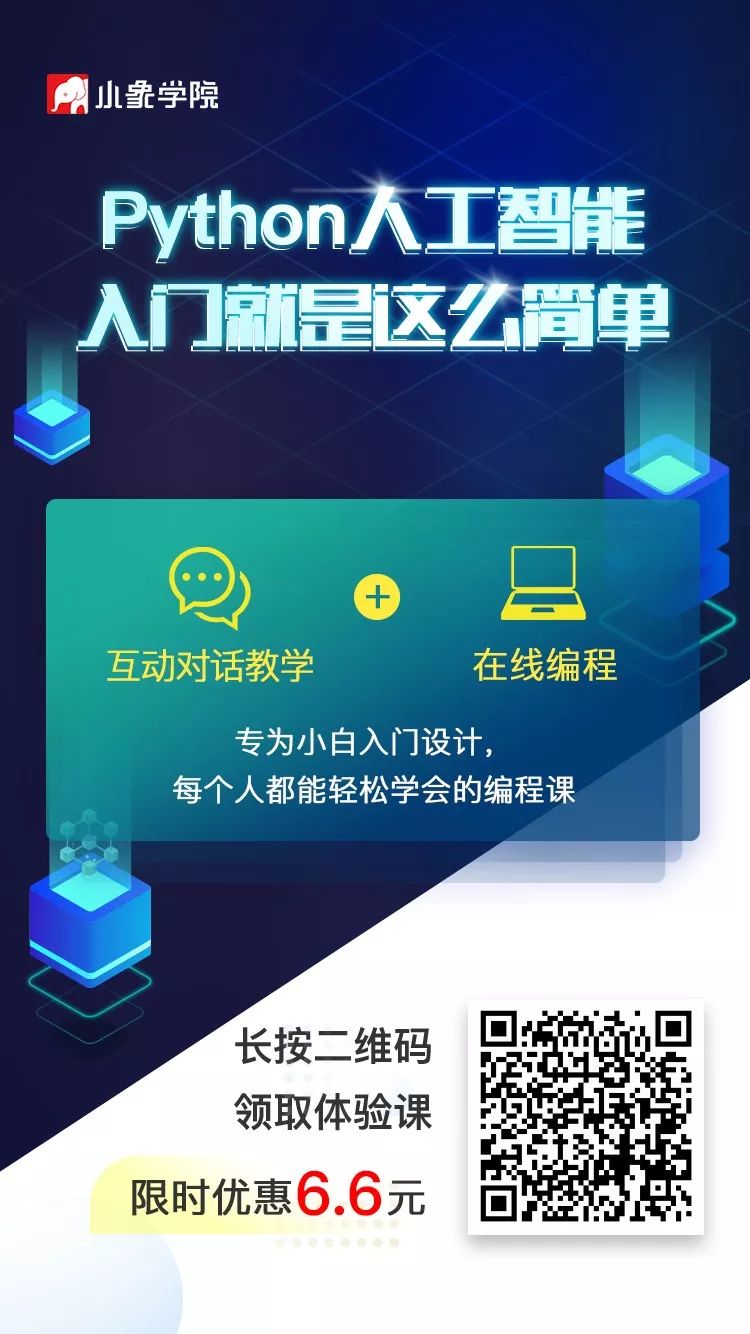 长按识别上方二维码,购买课程小象学院在人工智能教育领域是出了名的专业、负责,具备非常靠谱的讲师团队和稳定的内容输出, 被AI教父李开复誉为IT届的黄埔军校,并且引领创新工场做战略投资。现已有100W+学员在小象学院学习人工智能和大数据的在线课程这次特别申请到6.6元底价体验课,带你体验前四关,完成6个案例实操,入门Python人工智能