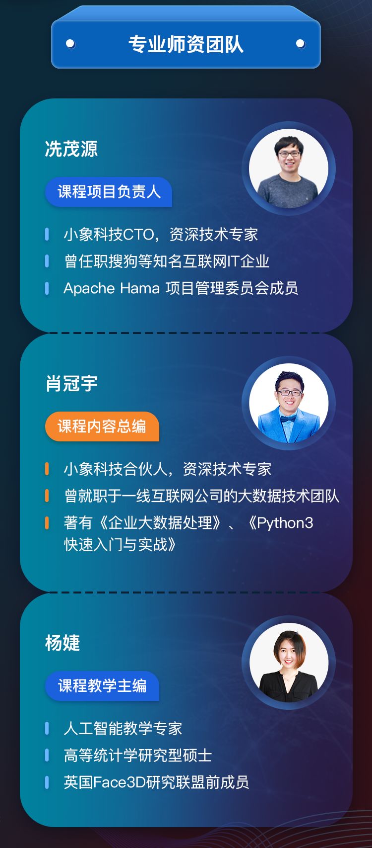 我之前也想去学点编程知识,看过线上视频,也买过书,但是最后都半途而废了。然而小象的这个编程体验课,却让我打开眼界,说它是对文科生最为友好的编程入门课也毫不为过,而且不是录播视频、也不是扔给你一堆网盘资料自学。在这里可以用全新的形态来学编程,通过全套课程学习完整的Python基础知识框架,掌握的计算机编程思维和编程技巧都能直接用到日常学习与工作中小象学院深耕人工智能和大数据技术领域,教学团队全部是来自工业界和学术界的一线专家,经过7年的专业沉淀,只把最实用和最专业的技术传递给大家。本课程经过教研组和数位业内专家精心打磨、多次迭代,打造出