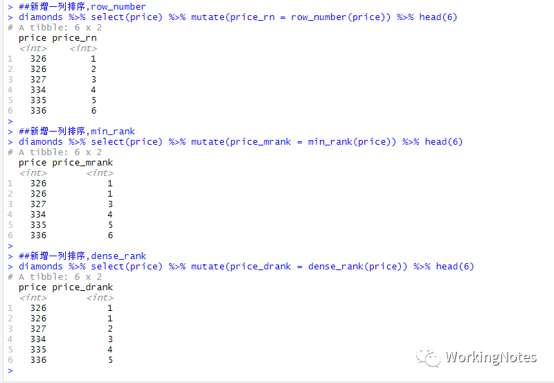 diamonds %>% select(price) %>% mutate(price_mrank = min_rank(price)) %>% head(6)