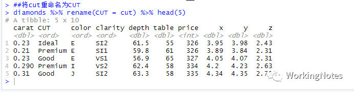 #diamonds %>% rename(CUT = cut) %>% head(5)