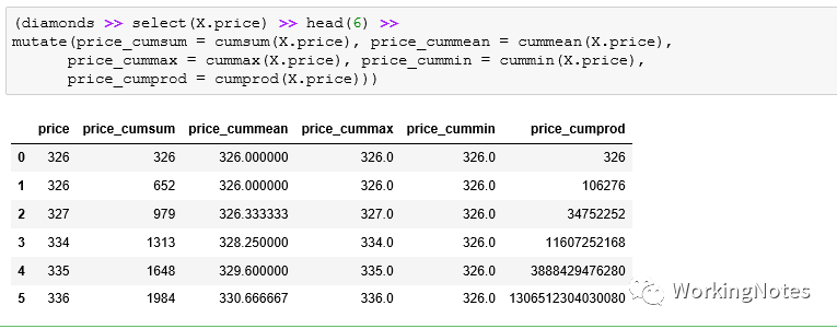 (diamonds >> select(X.price) >> head(6) >>mutate(price_cumsum = cumsum(X.price), price_cummean = cummean(X.price), price_cummax = cummax(X.price), price_cummin = cummin(X.price), price_cumprod = cumprod(X.price)))