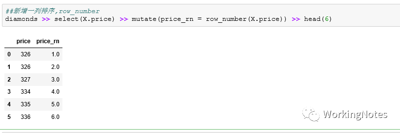 diamonds >> select(X.price) >> mutate(price_rn = row_number(X.price)) >> head(6)