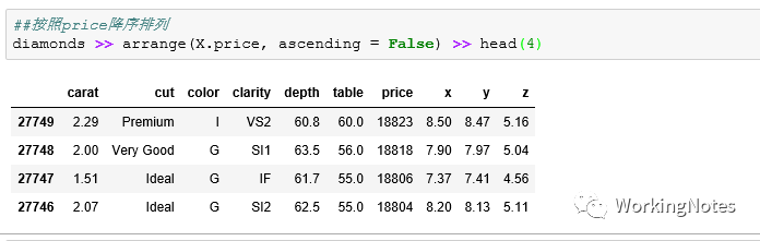 diamonds >> arrange(X.price, ascending = False) >> head(4)