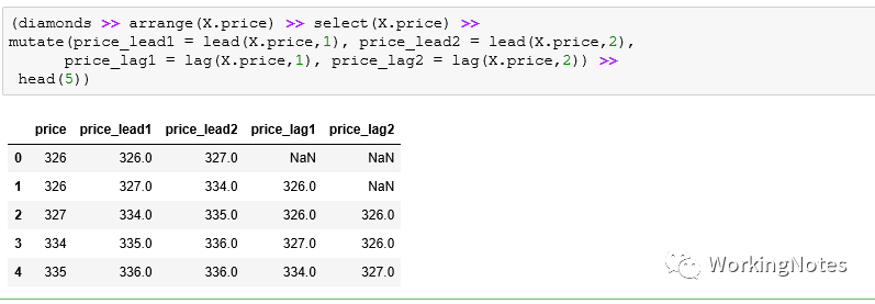 (diamonds >> arrange(X.price) >> select(X.price) >>mutate(price_lead1 = lead(X.price,1), price_lead2 = lead(X.price,2), price_lag1 = lag(X.price,1), price_lag2 = lag(X.price,2)) >> head(5))