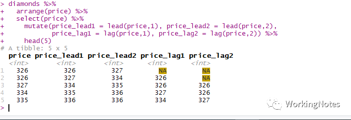 diamonds %>% arrange(price) %>% select(price) %>% mutate(price_lead1 = lead(price,1), price_lead2 = lead(price,2), price_lag1 = lag(price,1), price_lag2 = lag(price,2)) %>% head(5)