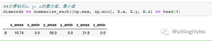 ###计算x、y、z的最大值和最小值diamonds >> summarize_each([np.max, np.min], X.x, X.y, X.z) >> head(4)