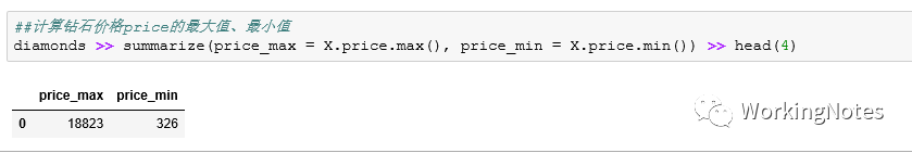 diamonds >> summarize(price_max = X.price.max(), price_min = X.price.min()) >> head(4)
