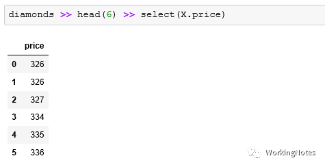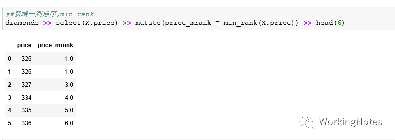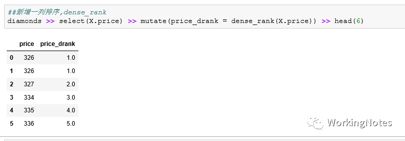 diamonds >> select(X.price) >> mutate(price_drank = dense_rank(X.price)) >> head(6)