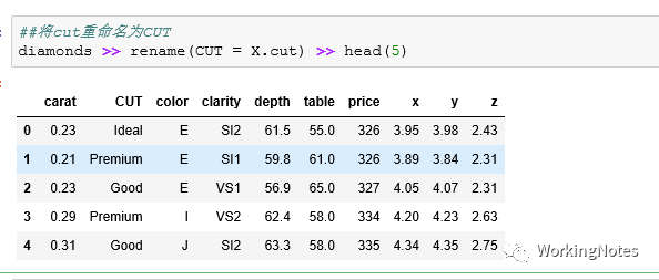 diamonds >> rename(CUT = X.cut) >> head(5)