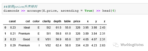 from dfply import *import numpy as npimport pandas as pddiamonds >> arrange(X.price, ascending = True) >> head(4)
