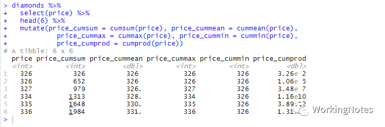 diamonds %>% select(price) %>% head(6) %>% mutate(price_cumsum = cumsum(price), price_cummean = cummean(price), price_cummax = cummax(price), price_cummin = cummin(price), price_cumprod = cumprod(price))