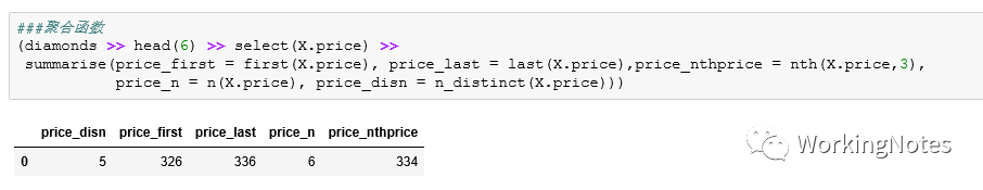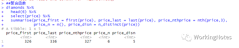 (diamonds >> head(6) >> select(X.price) >> summarise(price_first = first(X.price), price_last = last(X.price),price_nthprice = nth(X.price,3), price_n = n(X.price), price_disn = n_distinct(X.price)))